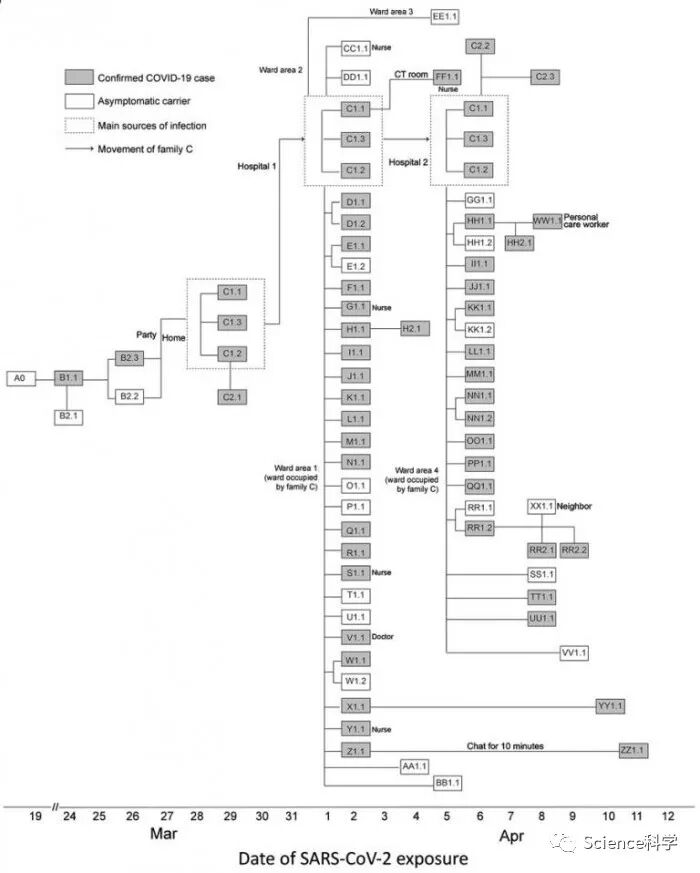 回到中国后,无症状者A0没有与任何一个邻居见面。患者B1.1住在楼下。B1.1的母亲(B2.2)和她的男友(B2.3)在3月26日来访,3月29日参加了一个聚会。两人随后与男子C1.1和他的儿子C1.2和C1.3见面。