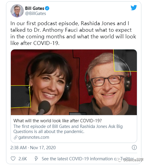 琼斯在播客节目中首先承认她对未来感到担忧,盖茨立即回应道:“其实我认为事情会好起来的”。他接着说,“这些疫苗中的许多疫苗发挥作用的可能性其实很高”。