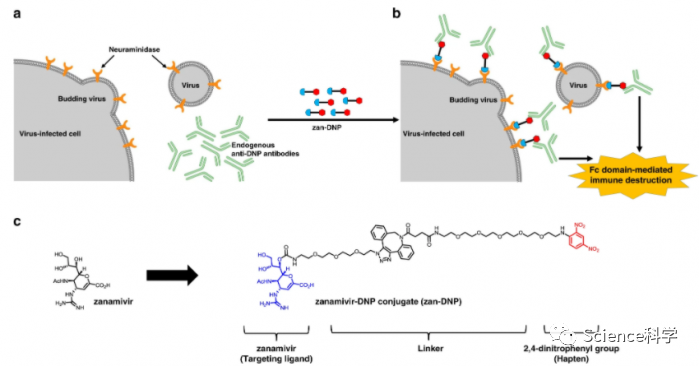 来自普渡大学的研究人员将神经氨酸酶抑制剂扎那米韦与针对游离病毒和感染细胞表面的二硝基苯(DNP)相结合。由此产生的名为zan-DNP的化合物可以阻断病毒的释放,并导致 “免疫介导的游离病毒和病毒感染细胞的消除”。