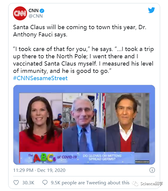 特朗普政府白宫新冠疫情应对工作组成员安东尼·福奇博士经常提出有科学依据支持的建议,以帮助减缓新冠病毒的传播。在周六的CNN芝麻街市政厅活动中,福奇告诉家长和孩子们,他为圣诞老人接种了COVID-19疫苗,所以他仍然可以像往常一样上门送礼物。