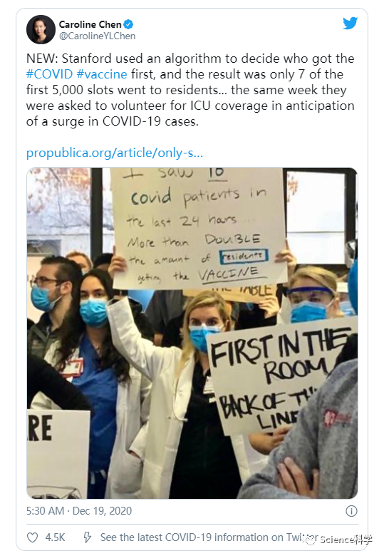 根据斯坦福大学首席居民委员会在12月17日发出的一封信中,确定哪位斯坦福大学医学院雇员将接受其首批5000剂COVID-19疫苗的算法仅包括名单上的7名医学住院医师/研究人员。此后,斯坦福大学医学院的领导层对此表示歉意,并承诺将对该计划进行重新评估。