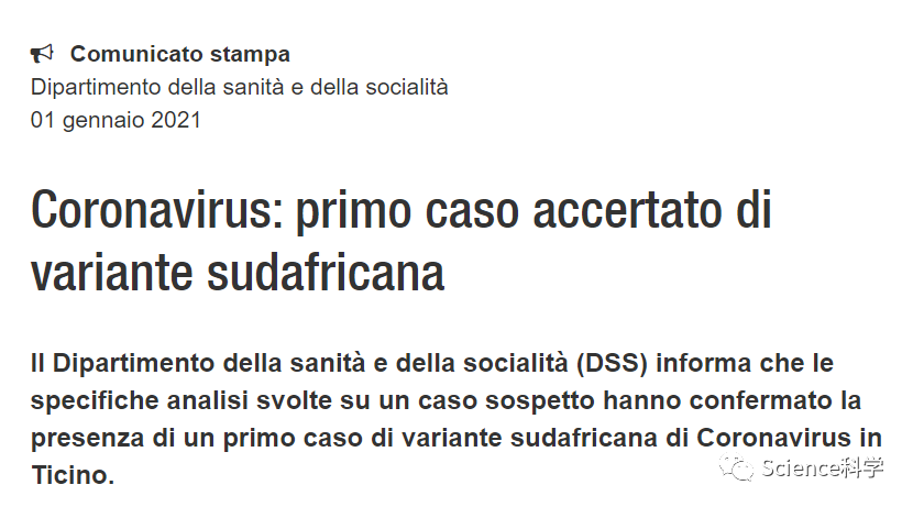 另据消息,当地时间1日,瑞士提契诺州卫生部门通报该州确认首例感染了南非发现的变异新冠病毒的病例。