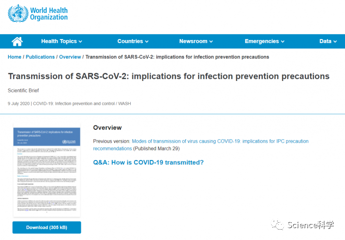 更新后的科学简报已经发表在世卫组织网站上,共有十页,详细介绍了SARS-CoV-2病毒的传播情况,以及“对预防感染措施的影响”。