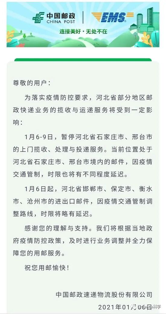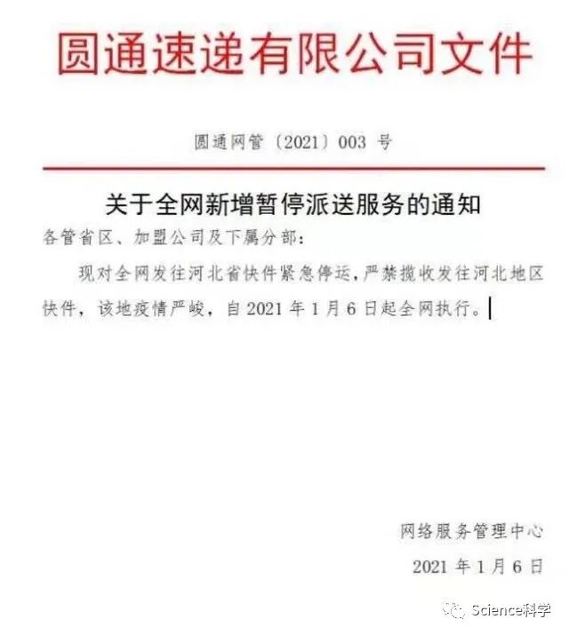 除了顺丰外,一封署名为圆通速递公司相关文件(编号:圆通网管(2021)003号文件)显示,因疫情原因,圆通速递发布通知,自1月6日起,对全网发往河北省快件紧急停运,同时严禁揽收快件。