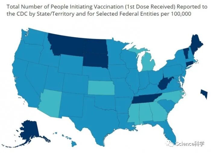 该跟踪系统的特点是通过一张互动地图说明美国各州已分发的疫苗数量,以及各州接受第一剂疫苗的人数。大多数州每10万居民得到3000至5000剂疫苗。加利福尼亚州、佛罗里达州和德克萨斯州分别发放了超过100万剂疫苗,但这三个州都还没有接种50万剂。