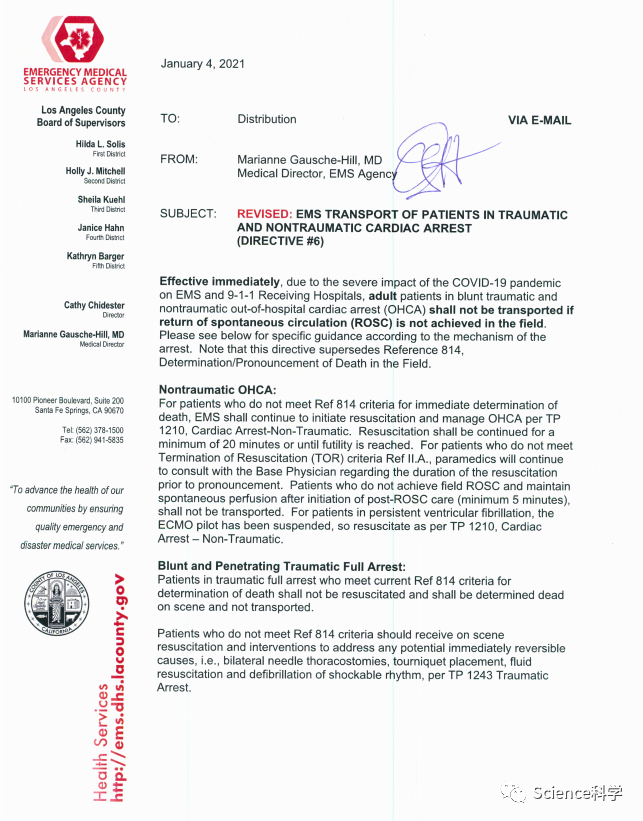 “我们并没有放弃抢救,”该机构的医疗总监Marianne Gausche-Hill博士告诉CBSLA。"我们强调的是,运送这些无法抢救的病人会导致非常糟糕的结果。我们已经知道了,我们只是不想影响我们的医院。" 所以至少那些被认为生存机会渺茫的特殊病人,现在将在现场被宣布死亡。