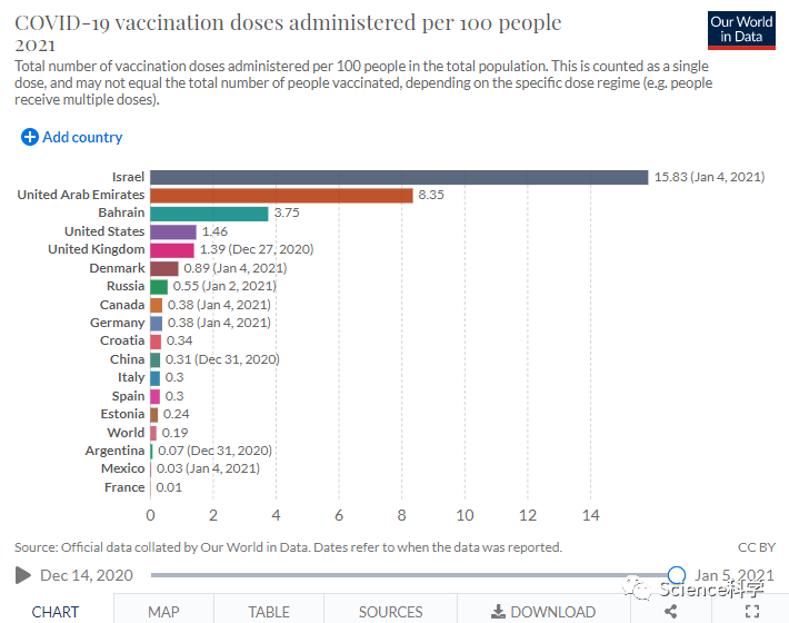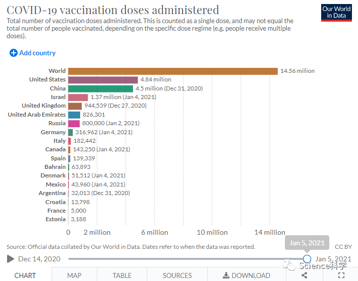 随着俄罗斯宣布在去年12月5日宣布开始大规模接种新冠疫苗,随即多国宣布开始接种新冠疫苗的计划,拉开了全球接种新冠疫苗的序幕。距俄罗斯开始接种疫苗已经过去一个月的时间,现在全球接种疫苗的情况如何?来自Our World In Data的数据显示,截止1月5日,全球新冠疫苗接种数量最多的国家是美国,接种率最高的国家是以色列。