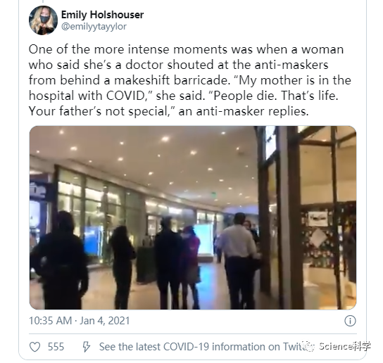 不过,这里更直观地说明了为什么洛杉矶的情况会如此糟糕。在这段视频中,抗议者痛骂一位医生,后者的母亲正因为COVID-19而住院。