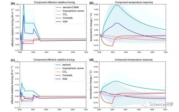 根据这项研究,气溶胶峰值变化是COVID-19受影响排放对辐射强迫和温度变化的最大贡献。这些变化比臭氧、二氧化碳和对流层的影响更大。这些变化对全球地表温度的影响 “估计是非常小的”,并且在几年内是短暂的。