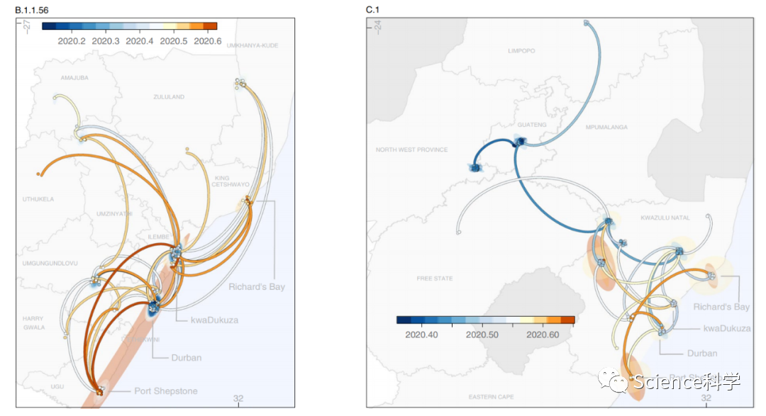 其中,B.1.1.54、B.1.1.54、C.1三种突变体在南非的第一波疫情中传播广泛,引发了当时南非约42%的感染。