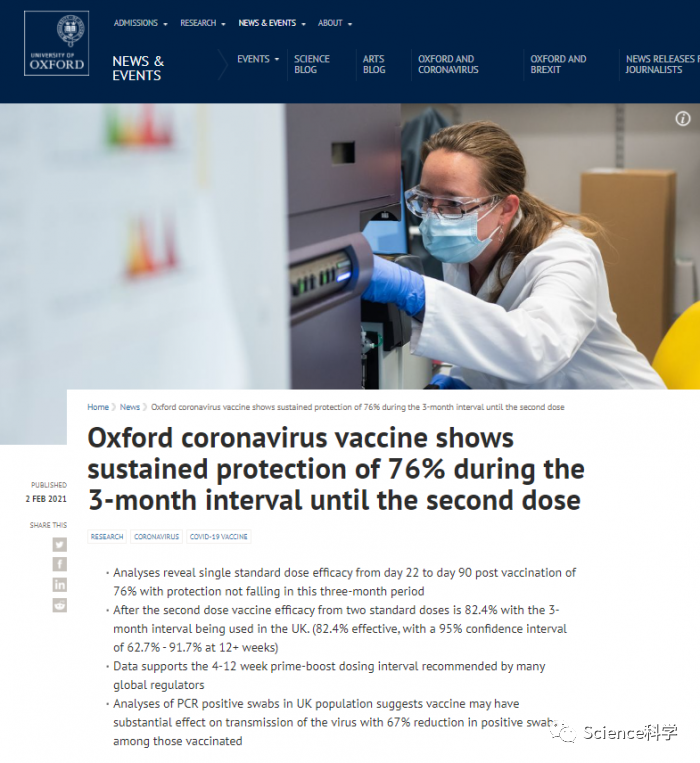 Andrew Pollard教授在一份声明中说:“这些新数据为包括MHRA和EMA在内的超过25个监管机构用于授予疫苗紧急使用授权的临时数据提供了重要验证。它还支持疫苗接种和免疫联合委员会(JCVI)提出的12周初效间隔的政策建议,因为他们正在寻找推出疫苗的最佳方法,并让我们放心,人们在单剂疫苗后22天内受到保护。”