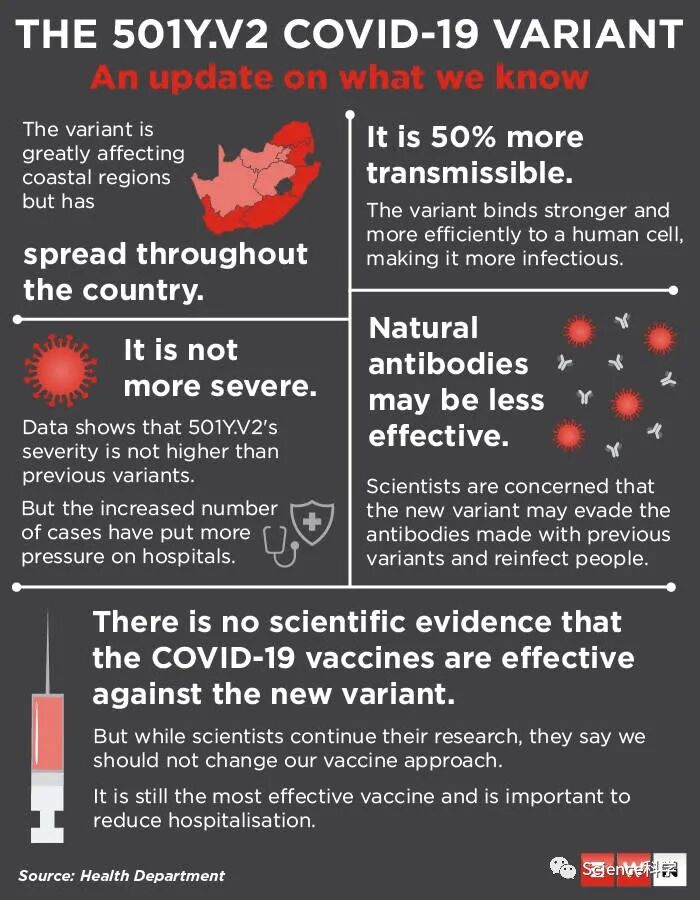 自2020年12月以来,南非报告的501Y.V2变异体已在全球迅速传播。其特点是S蛋白出现突变,使其具有更强的传染性,科学家担心它会降低疫苗的有效性。