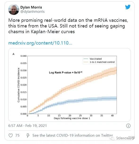 美国的其他人群,包括医护人员和其他必要的工作人员,也开始全面接种疫苗。这些疫苗也已经在保护他们了。一个研究团队考察了约3万名在梅奥诊所卫生系统有健康记录的接种者,研究人员指出,这些人应该主要是医护人员和长期护理机构的居民。该组中COVID-19的感染率在他们第一次接种疫苗后几周开始趋于平稳,而一组类似但未接种疫苗的人的感染率则继续攀升。