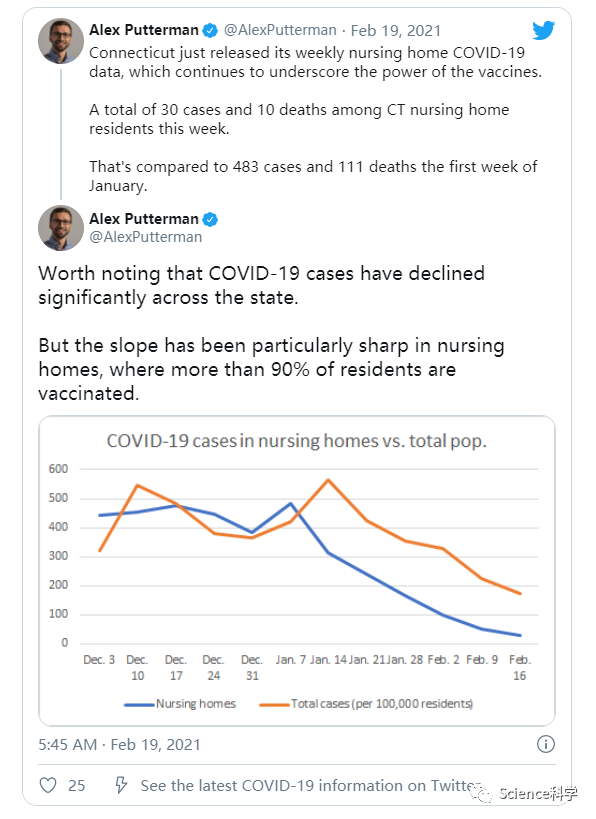 不过,有些人群的疫苗接种率足够高,好处开始显现。康涅狄格州是最早完成长期护理设施和养老院疫苗接种的州之一。所有想要接种疫苗的居民都在1月8日之前接种了第一剂疫苗,大多数人在1月底之前就已经全部接种完毕。