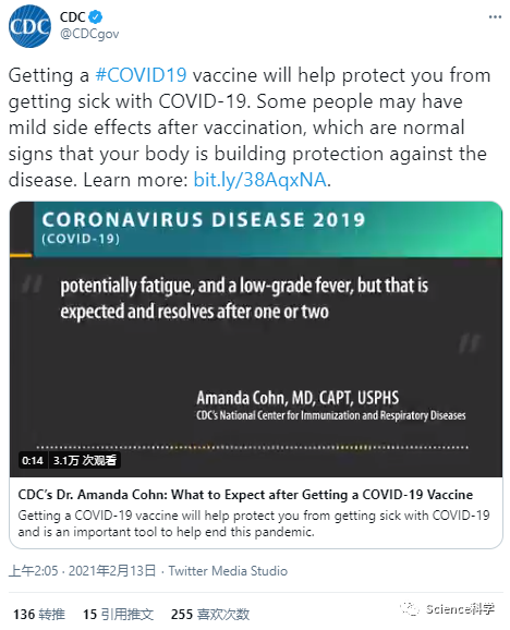美国疾控中心国家免疫和呼吸系统疾病中心成员阿曼达-科恩博士表示,有一个简单的方法来告诉人们疫苗正在发挥作用,她提到了三个副作用:一个是注射部位的疼痛。另一个是疲劳,有些人报告说,在接受第二剂疫苗后,感觉浑身乏力。