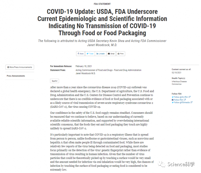 这个判断是基于全球超过1亿例的COVID-19病例,FDA说,没有一个导致实际的流行病学证据表明新冠病毒是通过食品或食品包装传播。通过国家或国际食品监测,也没有任何迹象表明是一种媒介。