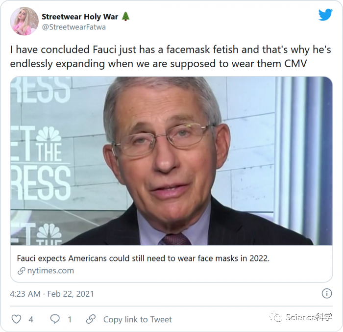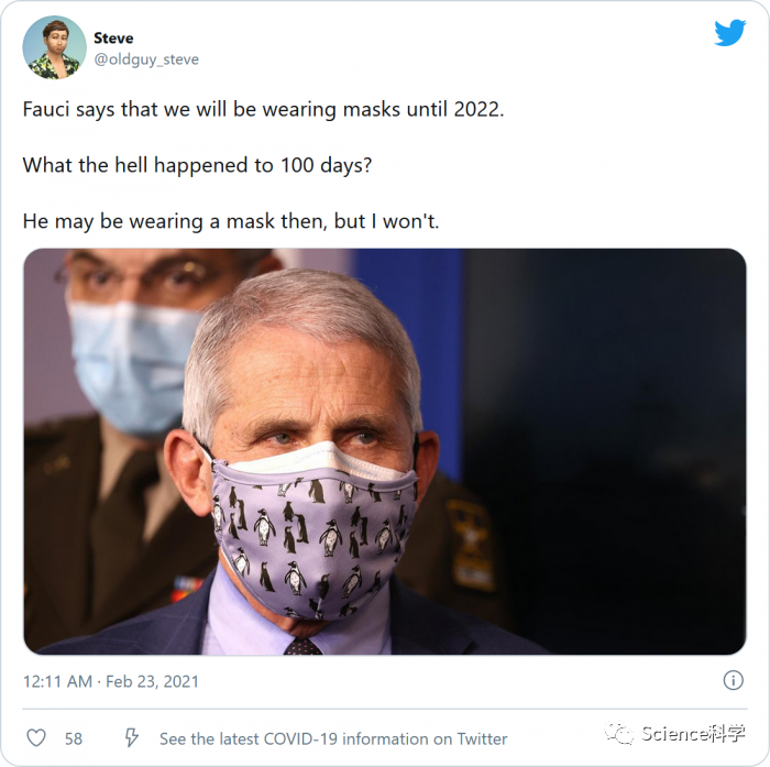 如果周末打开Twitter你将很有可能看到很多人对白宫首席医疗顾问安东尼·福奇博士发表的新冠病毒最新看法的不满。据悉,让大家谈论的是福奇博士在CNN采访时谈到的新冠病毒口罩预测。尽管美国的新冠病毒感染率及由此引发的住院率都在下降,另外新冠疫苗接种的工作也在不断进行,但福奇博士仍认为离民众在公众场合摘下口罩还有相当长的一段时间。