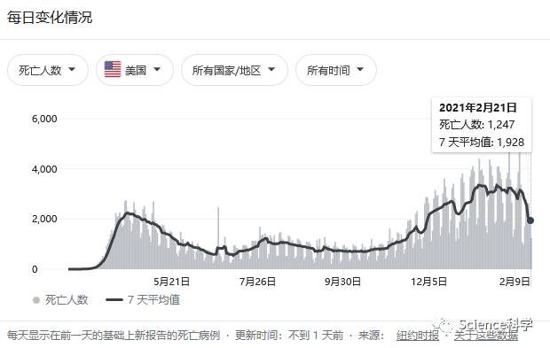美国累计新冠死亡病例数仍在持续攀升。数据显示,美国累计死亡病例于2020年5月27日超过10万例,9月22日超过20万例,12月14日超过30万例,2021年1月19日超过40万例。从10万例增加到20万例用时不到4个月,从20万例增加到30万例用时不到3个月,从30万例增加到40万例、从40万例增加到50万例均用时1个多月。