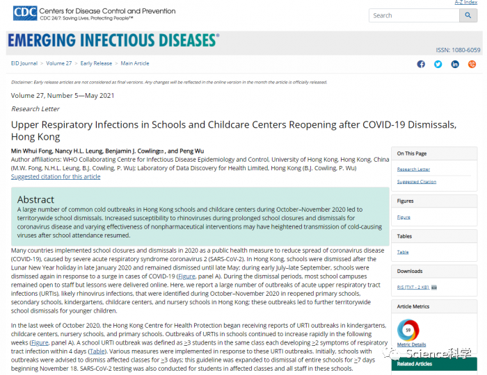 “在2020年10月的最后一周,”研究报告写道,“香港卫生防护中心开始收到幼儿园、托儿所、幼儿园和小学爆发URTI的报告。在接下来的几周内,学校爆发的URTIs继续迅速增加。”