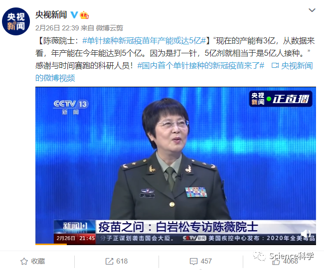 中国工程院院士陈薇接受采访时表示,我们做的是基因工程疫苗,基因工程疫苗最大的特点就是能够快速化的生产。我们现在这个产能,年产能在今年能达到5个亿是没有问题的。还有一个前提,我们因为是打一针,5亿剂相当于是5亿人的接种,不是2.5亿人的接种,这是另外一个概念。