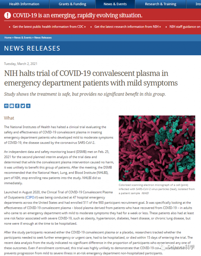 美国COVID-19恢复期血浆治疗试验被NIH叫停