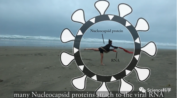 Masson-Forsythe挥舞着飘逸的红丝巾在海滩上优雅地跳舞,象征着病毒的遗传物质。为了说明核衣壳蛋白在SARS-COV-2病毒复制中的重要性,她突然出现在一个昏暗的房间里,她的手势摇摇晃晃,混乱不堪。然后她在森林里,变得时髦起来。