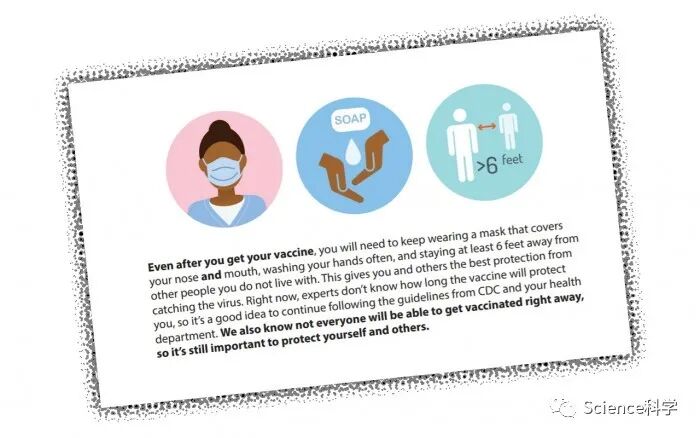 “即使在你接种疫苗后,你也需要继续戴上口罩来遮住嘴巴和鼻子,经常洗手,并与其他不在一起生活的人保持至少6英尺的距离。”