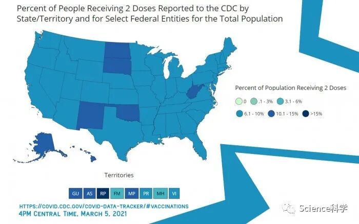 CDC跟踪报道了全美疫苗分布的数据,并提供了一个基本的图表,其中有各州的统计数据。在50个州的基本地图里面,大部分的州都在6.1-10%之间。这意味着每10个人中就有不到1个人被记录为接种过两剂COVID-19疫苗。西弗吉尼亚州、阿拉斯加、俄克拉荷马州、新墨西哥州以及北达科他州和南达科他州的18岁以上人口接种过两剂疫苗的比例在10.1-15%之间。