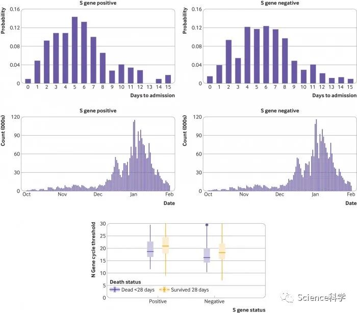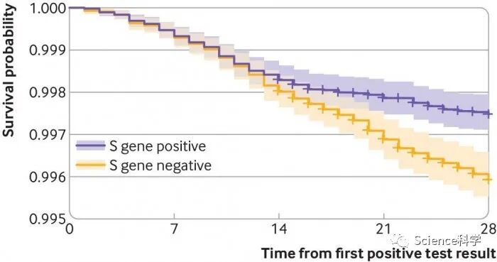 研究配图 - 2:英国 S 基因阳性 / 阴性的生存曲线(死亡率均较低)