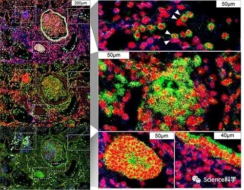 研究者在研究中采用的主要技术是一种叫做成像质细胞仪的技术很大程度上克服了这些限制。它使用一组金属标记的抗体,可以同时标记组织内细胞上多达几十种分子标记。一个特殊的激光扫描标记的组织切片,使金属标记汽化,金属的独特信号被检测到并与激光位置相关联。该技术可以精确地绘制出细胞在样本中的位置,以及每个细胞的表面受体和其他重要的识别标记。共分析了超过65万个细胞。