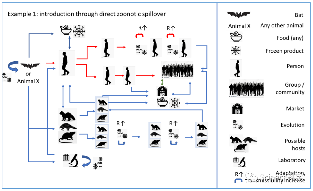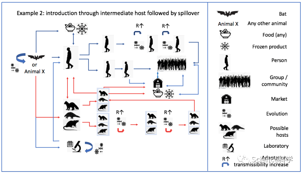 2.通过中间宿主引入,随后通过人畜共患传播,意味着新冠病毒从动物病毒库传播到一种中间宿主,然后在中间宿主中传播并且可能出现适应性变化,再从中间宿主传播到人类。