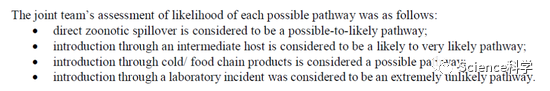 根据科学证据和研究结果,联合团队对这些引入途径的可能性进行了评估,评估的量表分为5档,从低到高分别为“极不可能”(extremely unlikely),“不太可能”(unlikely),“可能”(possible),“比较可能”(likely)和“非常可能”(very likely)。
