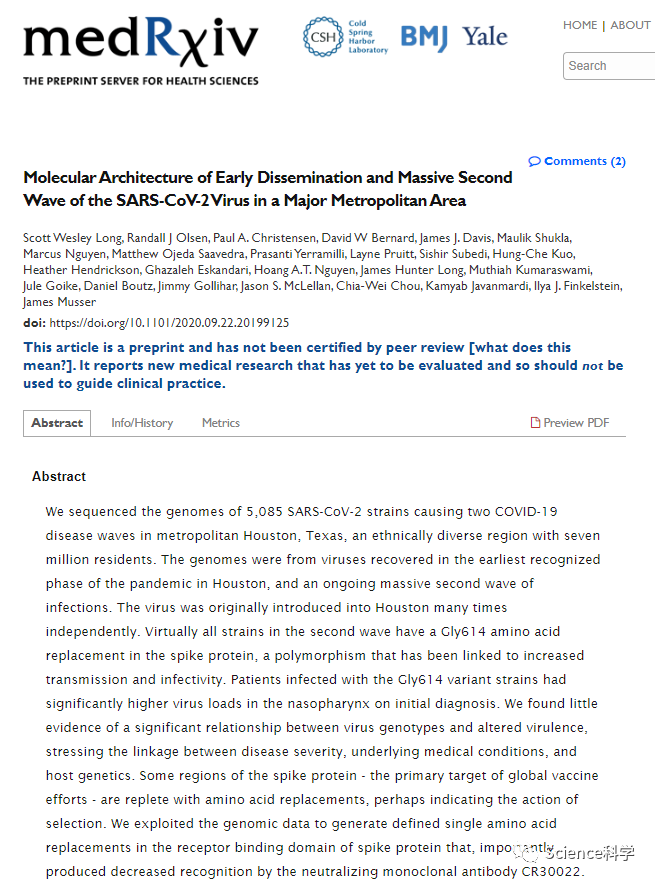 研究人员通过分析基因数据,解释了病毒是如何影响休斯顿街区的。病毒分别在不同的时间到达休斯顿,最初是通过航空旅行。在被研究的患者中,约有71%的人感染了D614G突变。《华盛顿邮报》引用了英国的一项更大的研究,该研究考察了25000个基因组。再次确定D614G是使病毒更具传染性的突变。