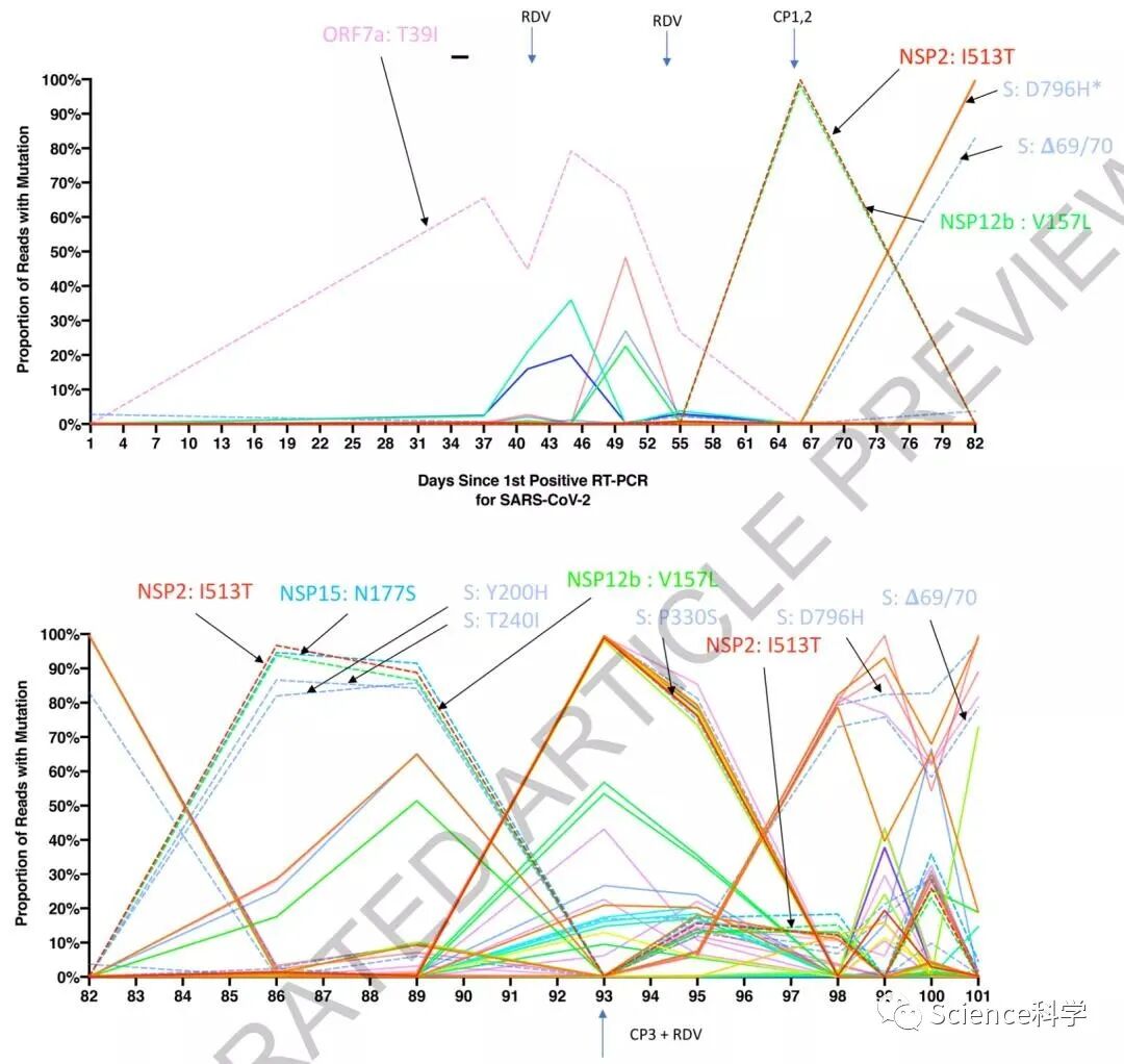 研究人员发现该患者体内一个新冠病毒变异株的比例开始增加。该变异株的刺突蛋白上出现了两个突变:一个是位点69/70的缺失突变(出现在英国变异株B.1.1.7中),还有一个会造成D796H替换的突变。该变异株在患者经历第三轮瑞德西韦(第93天)和恢复期血浆(第95天)治疗后又重新出现。