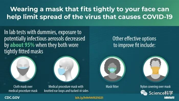 新研究发现,关键在于适合。美CDC使用假人进行了实验室测试,他们测试了戴在医用口罩上再佩戴一个布口罩和有能在耳朵打结部分的医用口罩。这两种方法都有效地改善了佩戴者面部周围的密封性。该机构表示,在戴紧口罩后,接触潜在感染气溶胶的几率被降低了95%左右。
