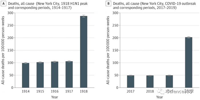 对此,来自布莱根妇女医院的Jeremy Faust领导了一支队伍展开了研究。其比较了COVID-19爆发前两个月纽约市的额外死亡人数以及疫情最严重两个月内纽约市的相同数据点。通过分析计算出,在西班牙流感大流行的高峰期,纽约市每10万人中有287人死亡。相比之下,在3月和4月COVID-19高峰期间,该市每10万人死亡人数为202。西班牙流感显然比COVID-19更致命,看起来好像是这样对吧?--然而事实并非如此......