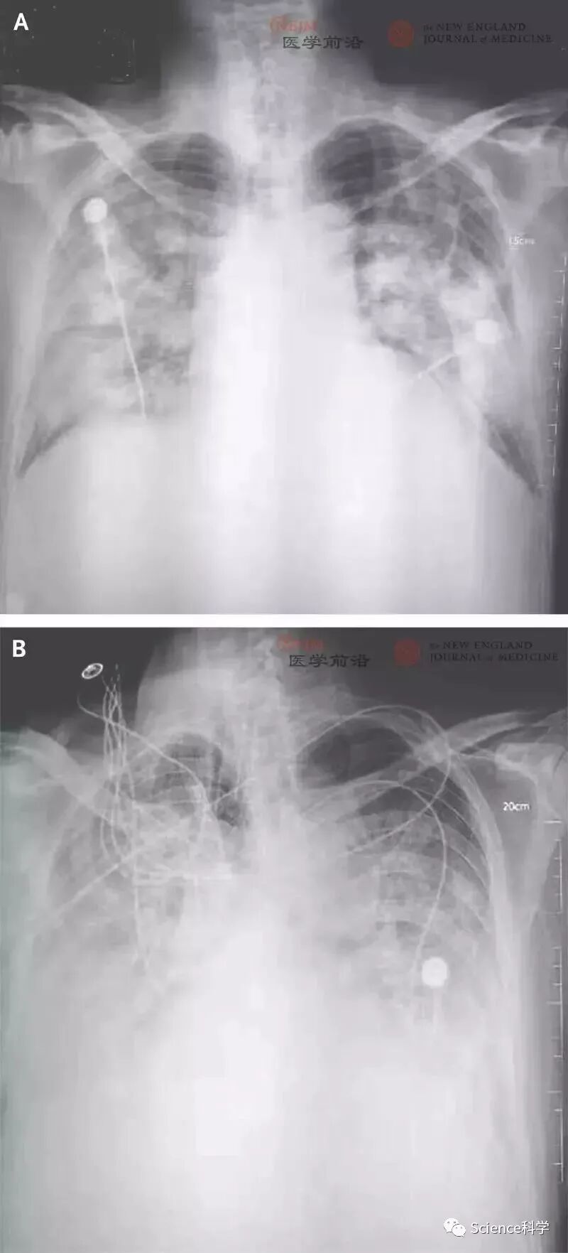 患者2初始症状从2019年12月20日开始,出现了发热和咳嗽。在起病后7天出现呼吸困难且后续2天进行性加重(胸片资料见图1),在此期间进行了机械通气。该患者曾经常出入海鲜市场采购。患者1和患者3在经过治疗后于2020年1月16日出院,但患者2在2020年1月9日死亡,没有采集到患者的组织标本。