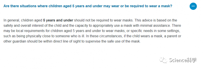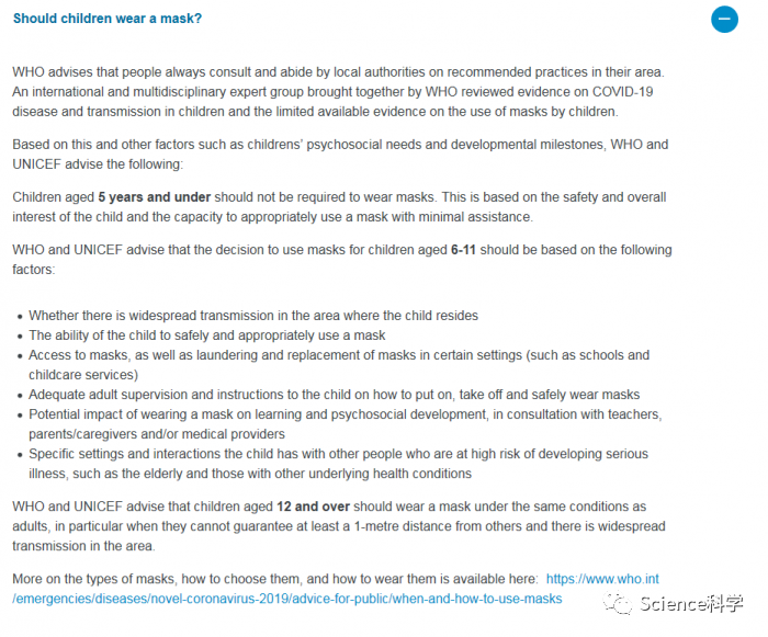 而 6-11 岁的儿童,要根据当地疫情、儿童日常接触的群体等多方面考量进行佩戴。而 12 岁及以上的儿童视同成年人,使用标准的社交隔离指南。世卫组织与儿童基金会、国际儿科协会和其他健康组织和专家合作,提出了指导方针。