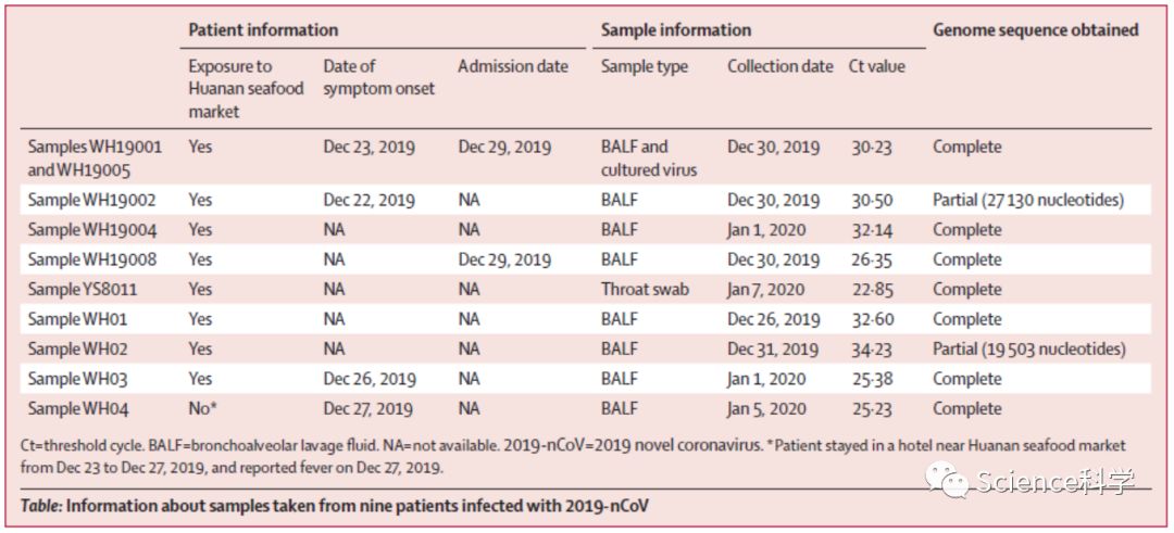 9名患者患有病毒性肺炎,并且常见呼吸道病原体呈阴性,去了至少三家位于武汉的医院就诊。他们中的8人在出现症状之前去过华南海鲜市场,另一人(WH04)没有去过市场,但于2019年12月23日至12月27日住在市场附近的酒店。