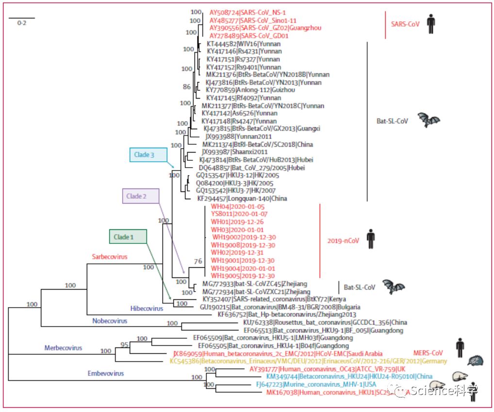 第三,2019-nCoV与其近亲bat-SL-CoVZC45和bat-SL-CoVZXC21之间的序列同源性小于90%,因此,bat-SL-CoVZC45和bat-SL-CoVZXC21不是2019-nCoV的直接祖先。