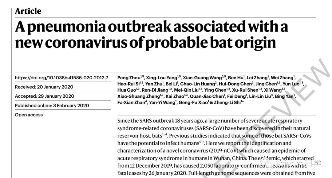 国际顶级学术期刊《自然》(Nature)以“加快评审文章”(Accelerated Article Preview)形式在线发表了中国科学院武汉病毒研究所石正丽团队关于新型冠状病毒(2019-nCoV)的研究论文,该论文于2020年1月20日提交,1月29日被期刊接收,最终在线发表于2月3日。这也是《自然》首次以正式论文的形式刊发关于2019-nCoV的研究。