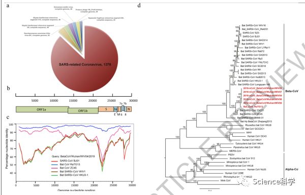 研究团队发现,在其中5名病人身上获取的全长度基因组序列彼此之间几乎完全一致(相似度超过99.9%),与SARS冠状病毒有79.5%的序列一致。此外,研究人员发现该病毒序列与一种蝙蝠冠状病毒在全基因组水平上相似度高达96%,表明蝙蝠可能是该冠状病毒的来源。