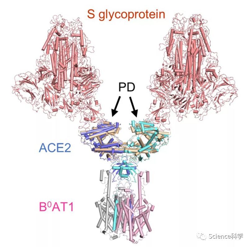 比如,ACE2的二聚体与新冠病毒S蛋白的三聚体是否可以发生更高层级的交联,从而促进病毒与宿主细胞膜的融合或者内吞?之前有研究表明ACE2的胞外区如果被切割,将会更有效地促进冠状病毒的侵染,但是ACE2与B0AT1的复合物结构显示B0AT1的存在有可能阻碍蛋白酶靠近这个切割位点,这是否解释了病毒侵染症状主要发生在没有B0AT1的肺部?