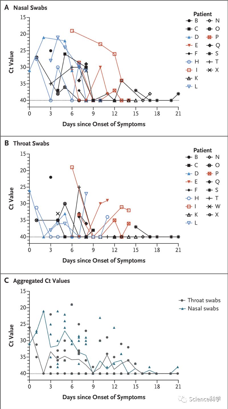 研究人员在广东珠海的18例患者(9例男性和9例女性,中位年龄59岁;范围26至76)中监测了上呼吸道样本有新冠病毒载量,其中包括两个家庭中的4例继发性感染(其中1人从未出现症状,下文中的“患者Z”)。无症状患者之所以被发现,是他与已知病例的密切接触,因此受到监视。