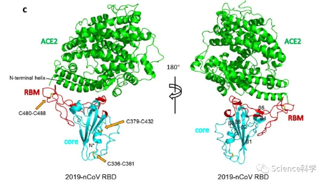与ACE2结合的2019-nCoV RBD的总体结构:ACE2为绿色,2019-nCoV RBD核心为青色,RBM为红色,2019-nCoV RBD中的二硫键显示为棒状并用黄色箭头指示,负责结合的ACE2的N末端螺旋被标记