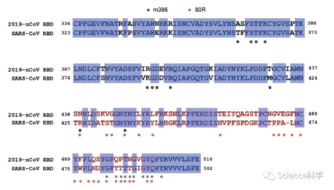 在不能与2019-nCoV RBD结合的3种抗体中,研究团队通过对SARS-CoV RBD-Fab复合物的高分辨晶体结构解析了其中2种(m396和80R)的表位。通过将这些表位残基映射到SARS-CoV RBD序列和2019-nCoV RBD序列,研究团队发现,和SARS-CoV相比,2019-nCoV RBD上抗体m396的21个抗原表位有7个残基改变,抗体80R的24个抗原表位则有15个残基改变。