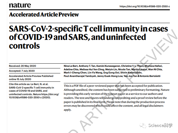 发表在《自然》杂志上的这篇文章,介绍了针对 COVID-19 患者与未感染的对照组的研究结果,结果在某些得过普通感冒的人身上检出了针对 SARS-CoV-2 的特异性 T 细胞免疫。