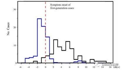 在第一代病例的症状发作日期集中之后,第二代病例的感染曲线的峰值显示在第一代病例的症状发作日期之前。