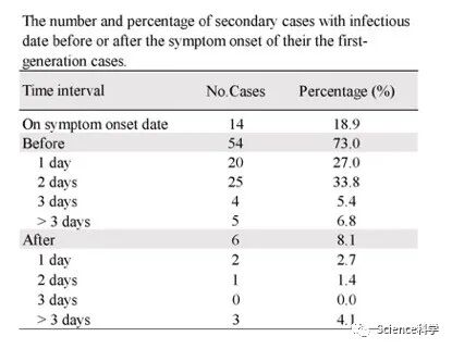 大多数继发病例(73.0%)在第一代病例症状发作之前被感染,而18.9%和8.1%分别在第一代病例症状发作之日和之后被感染。