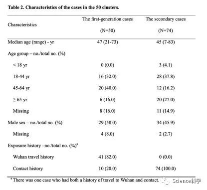 在感染新冠病毒的50个集群中,第一代病例的中位年龄为47岁(范围为21至73岁),其中男性为58.0%,有去武汉的历史。